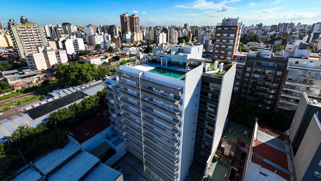 Las cocheras se sitúan en subsuelo y planta baja. El edificio contará con SUM en planta baja, gimnasio y pileta con terraza verde en el piso 11 con vistas panorámicas hacia el barrio.